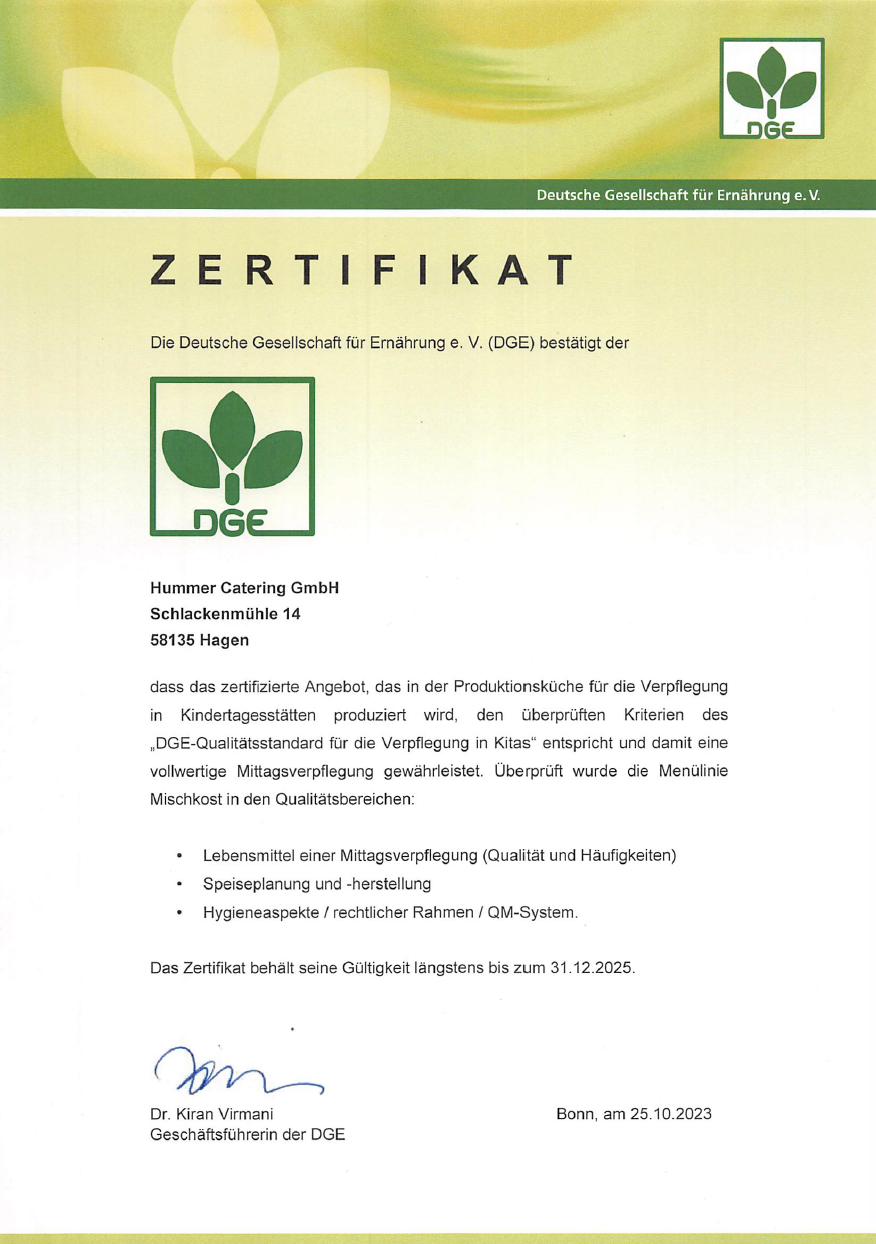 Hummer Menü wurde als Catering-Unternehmen in Hagen mit einer Menülinie für Kitas von der Deutschen Gesellschaft für Ernährung e.V. (DGE) zertifiziert. Auf Basis des „DGE Qualitätsstandard für die Verpflegung in Tageseinrichtungen für Kinder“ wurden die folgenden Kriterien überprüft:
