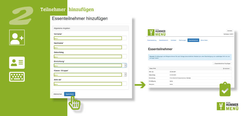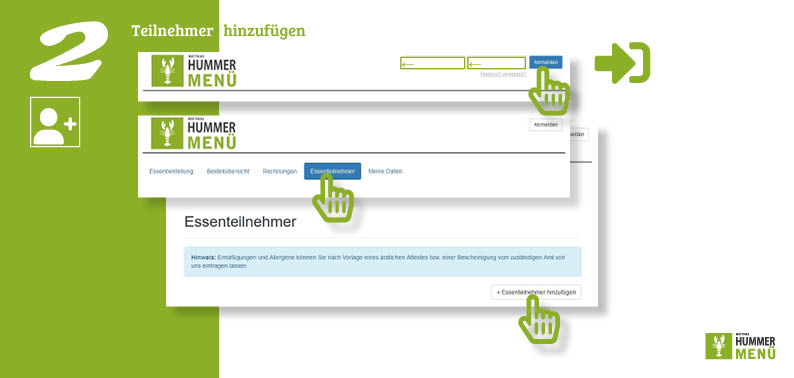Nach Abschicken des Formulars wird Ihnen Ihr Passwort per E-Mail zugeschicktAlle Angaben zum Essenteilnehmer tragen Sie dann bitte in Ihrem Kundenkonto ein.