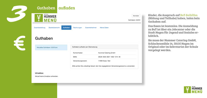 Ausnahme: Wenn eine Gesamtabrechnung über die Einrichtung (Schule oder Firma) erfolgt, wird kein Guthaben benötigt.