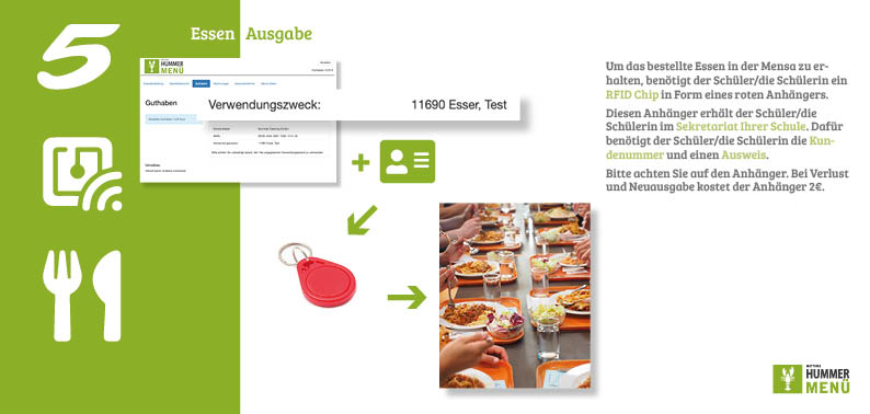 Um das bestellte Essen in der Mensa zu erhalten, benötigt der Schüler/die Schülerin ein RFID Chip in Form eines roten Anhängers. Diesen Anhänger erhält der Schüler/die Schülerin im Sekretariat Ihrer Schule. Dafür benötigt der Schüler/die Schülerin die Kundenummer und einen Ausweis.